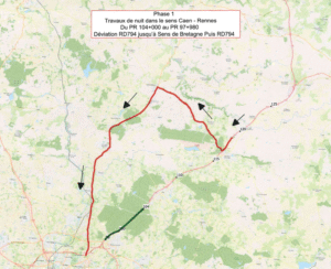 Pour réduire la gêne pour les usagers, les travaux dureront 7 semaines et auront lieu uniquement la nuit, du lundi soir au vendredi matin. Selon l’avancée du chantier, certaines portions de route seront fermées d’abord en direction de Rennes, puis d’autres en direction de Caen. Les deux sens de circulation ne seront jamais fermés en même temps sur une même zone.