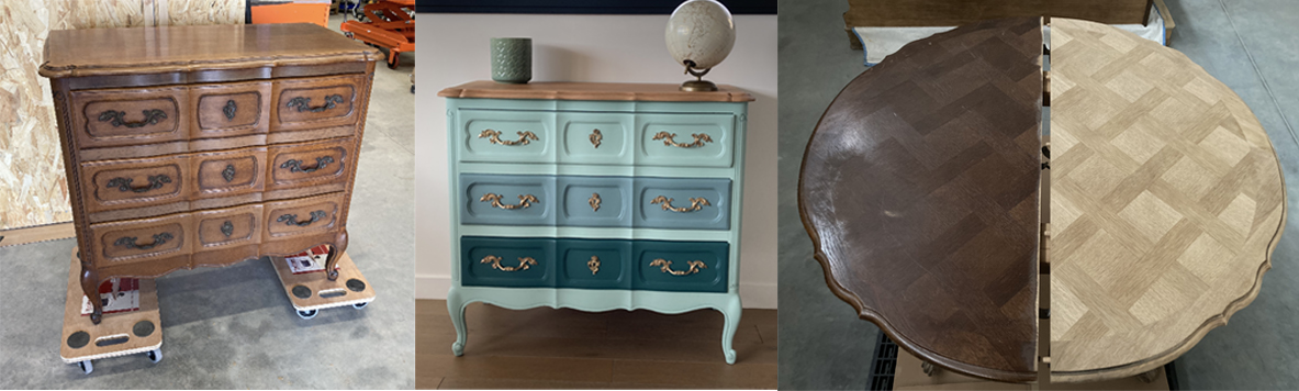 Elles rénovent les meubles avec des produits biosourcés et à base aqueuse afin d’avoir un minimum d’impact écologique sur notre environnement. Vos meubles deviennent uniques et à votre goût.